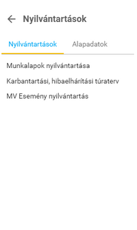 A Nyilvántartások fülön a JOB (feladat) és JOBPROCESS (feldolgozási lánc), míg az Alapadatok fülön a készletként definiált DATASTRUCTURE megjelenítési módú nyilvántartások jelennek meg. A kívánt nyilvántartást a nyilvántartás elnevezésére kattintva lehet a felületre nyitni. A kattintást követően a választósáv eltűnik, ha újra meg akarjuk jeleníteni, az alsó dock menü nagyító piktogrammal jelölt gombjára, vagy a menüsávon újra a nyilvántartások menüpontra kell kattintani.
