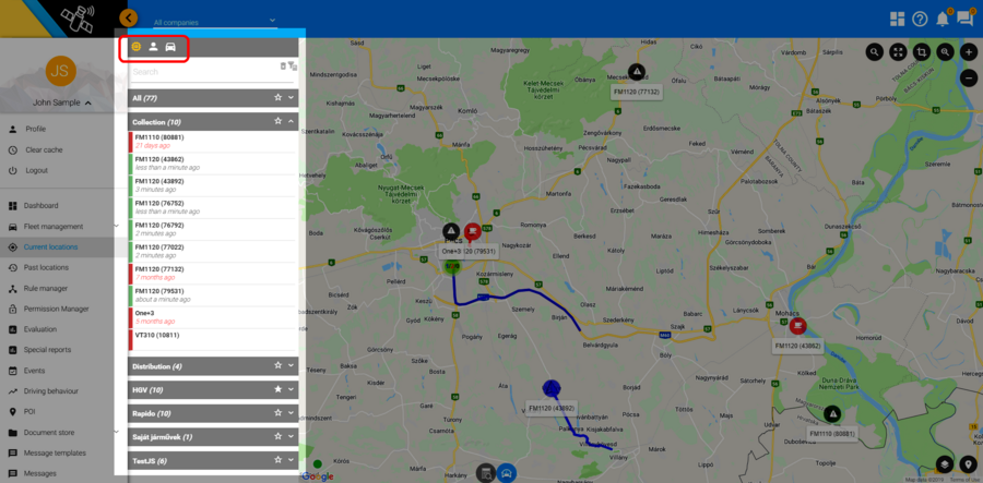 Az ablak bal felső sarkában található gombokkal lehet választani az eszköz, személy és jármű nézet megjelenítése között. Alapértelmezetten a tételek a listában az Összes elnevezésű csoportban láthatóak, amennyiben azonban a felhasználó létrehozott csoportot vagy csoportokat, akkor a tételek ezekbe a csoportokba rendezve is megjelennek.