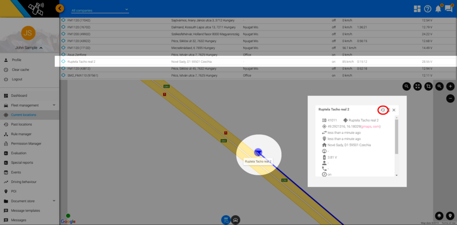 Eszköz nézetet választva, térképen a jármű ikonra kattintva megnyíló információs ablakban a jármű aktuális adatai, valamint az ablak jobb felső sarkában a korábbi pozíciókba navigáló ikon található, amellyel Múltbéli pozíciók és a Kiértékelés funkciókba juthatunk egy kattintással.