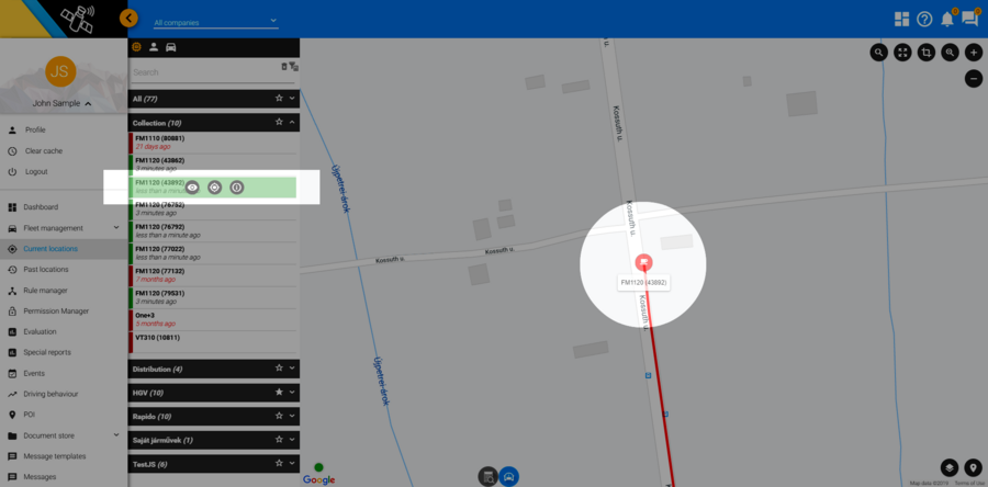 A követés gomb mellett látható „i” betűre kattintva a járműbe szerelt eszköz által szolgáltatott adatok válnak láthatóvá.